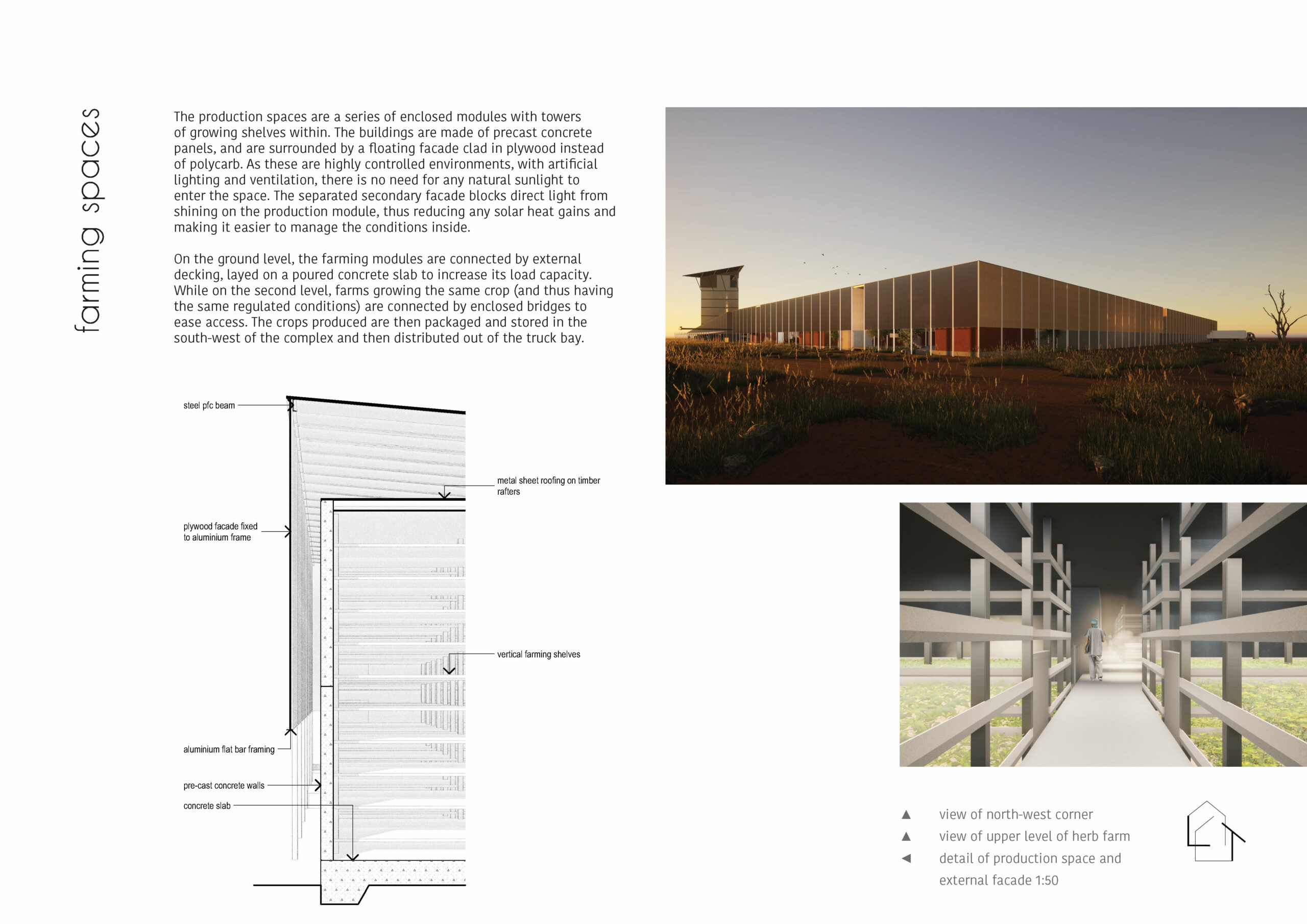 Beginning with the simplicity of one dish – mushroom gnocchi – the proposed Vertical Farm is a highly functional factory, growing mushrooms, potatoes and herbs, that also serves as a ‘landmark’ public space for the Central Highlands Region.