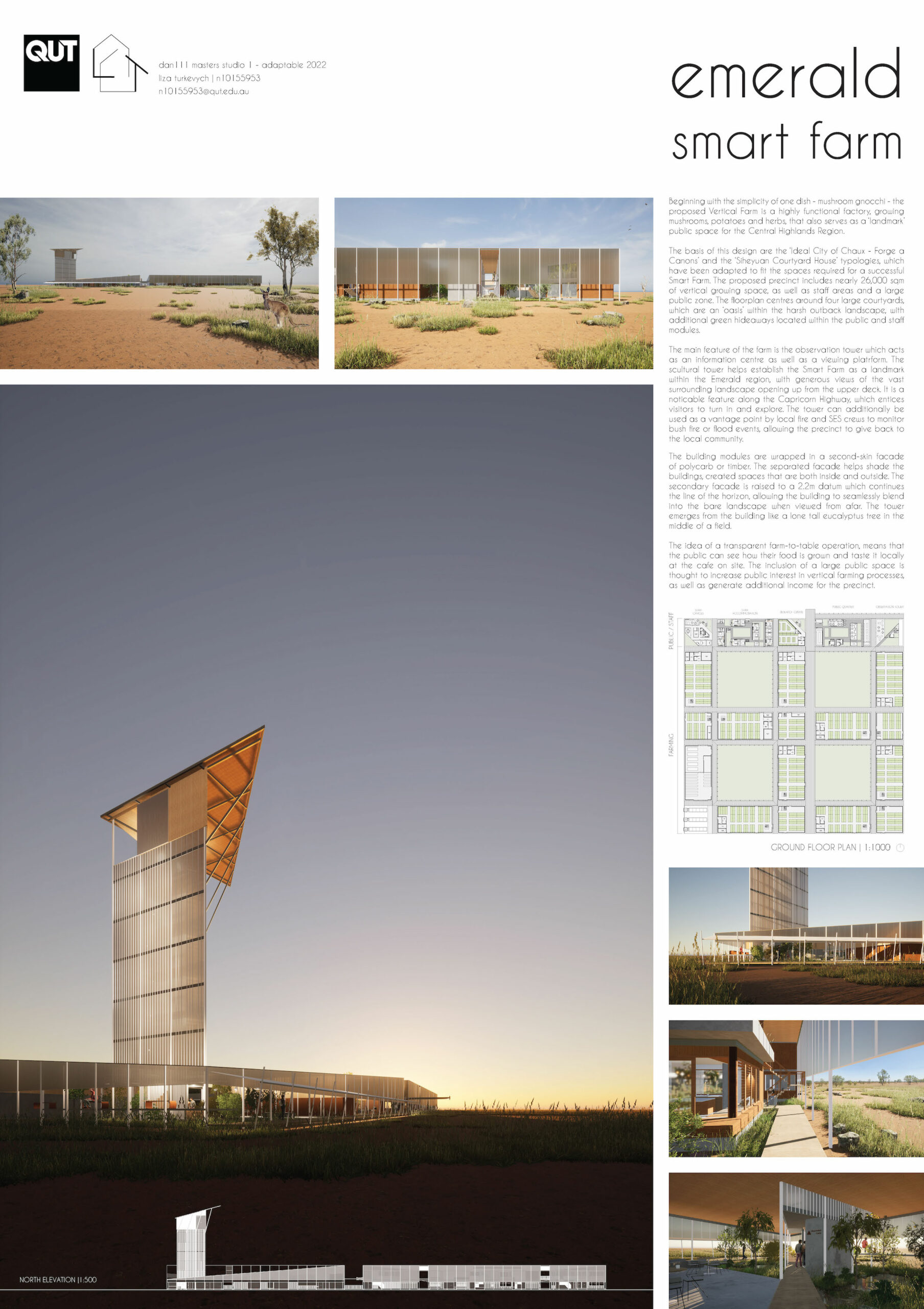 The basis of this design are the ‘Ideal City of Chaux – Forge a Canons’ and the ‘Siheyuan Courtyard House’ typologies, which have been adapted to fit the spaces required for a successful Smart Farm. The proposed precinct includes nearly 26,000 sqm of vertical growing space, as well as staff areas and a large public zone. The floorplan centres around four large courtyards, which are an ‘oasis’ within the harsh outback landscape, with additional green hideaways located within the public and staff modules.